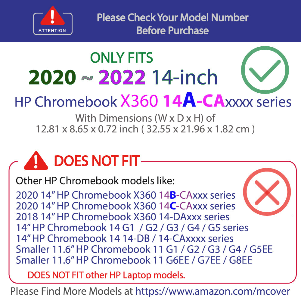 Designed to perfectly fit the 2020~2022 14" HP Chromebook x360 14a-CA0000 series laptops with dimension ( W x D x H ): 12.81 x 8.65 x 0.72 inch ( 32.55 x 21.96 x 1.82 cm )