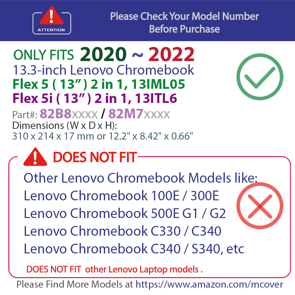 - Designed to perfectly fit the 2020~2022 13.3" Lenovo IdeaPad Flex 5 (13") Chromebook 13IML05 / Flex 5i Chromebook 13ITL6 2 in 1 Laptop Computers with dimension of 310 x 214 x 17 mm or 12.2 x 8.42 x 0.66 inch