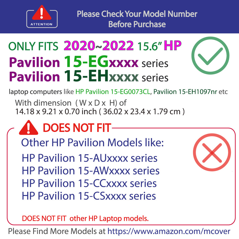 Designed to perfectly fit the 2020 ~ 2022 15.6" HP Pavilion 15-EGxxxx / Pavilion 15-EHxxxx Series Laptop with dimension of 14.18 x 9.21 x 0.70 ( 36.02 x 23.4 x 1.79 cm )