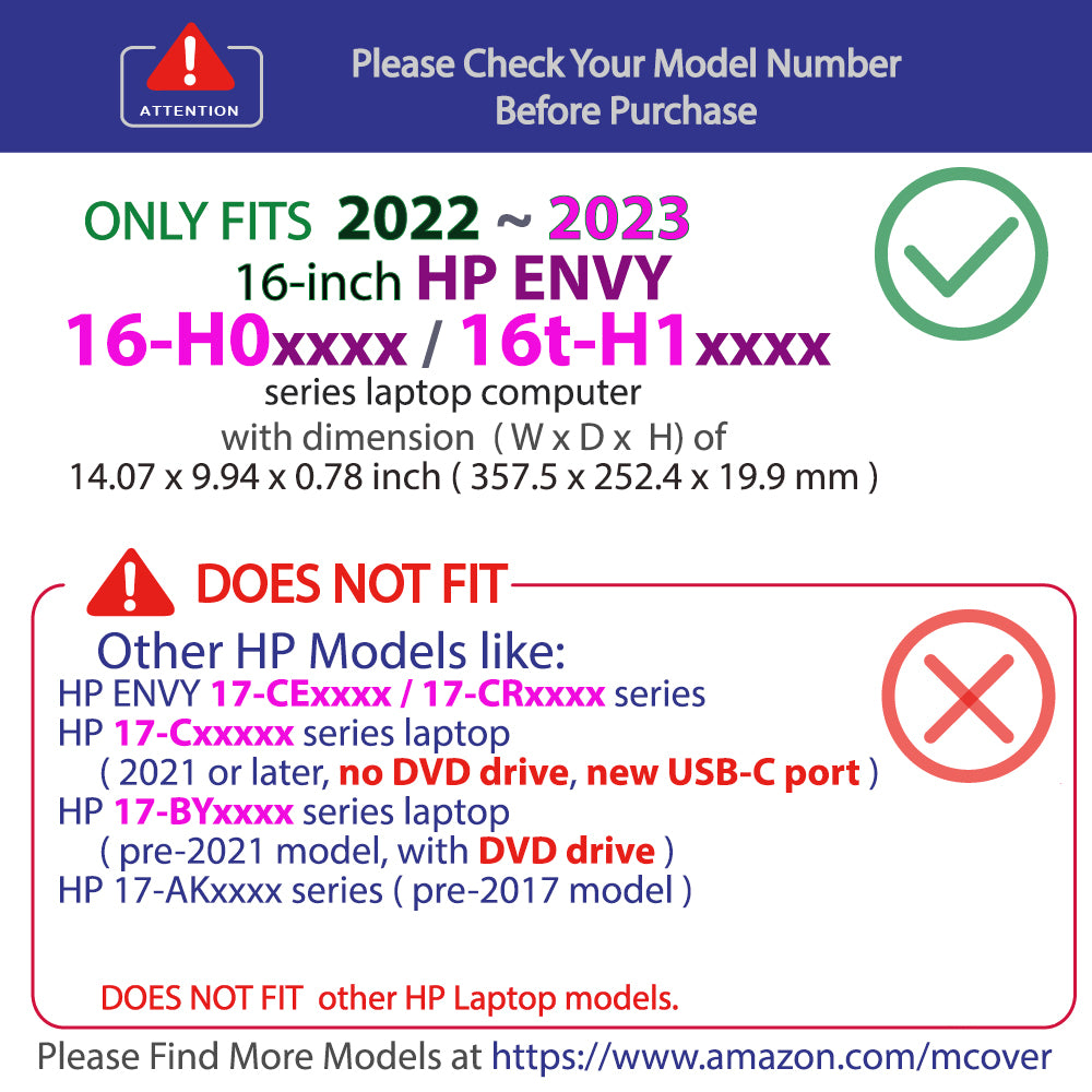 Designed to perfectly fit the 16" HP ENVY 16-H0xxx / 16-1xxxx series laptop computers with dimension( Width x Depth x Height ) of 14.07 x 9.94 x 0.78 inch ( 357.5 x 252.4 x 19.9 mm )
