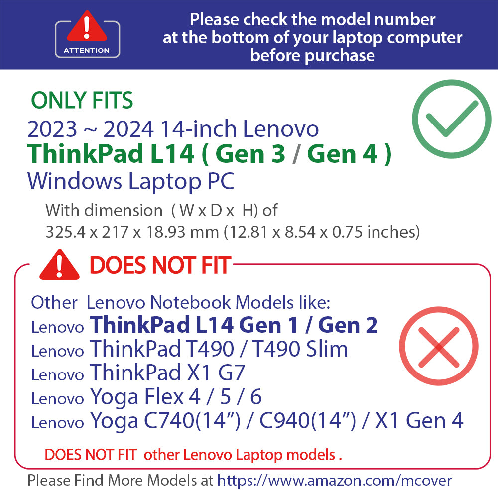Designed to ONLY fit the 2023 - 2024 14" Lenovo ThinkPad L14 Gen 3 / Gen 4 series Windows Laptop Computers with Dimensions (Width x Length x Height) of 325.4 x 217 x 18.93 mm (12.81 x 8.54 x 0.75 inches)