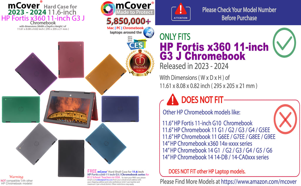 Designed to perfectly fit the 2023 -2024 11.6-inch HP Fortis x360 11 inch G3 J Chromebook laptop computer with dimensions (w x d x h) of 11.61 x 8.08 x 0.82 inch ( 295 x 205 x 21 mm )