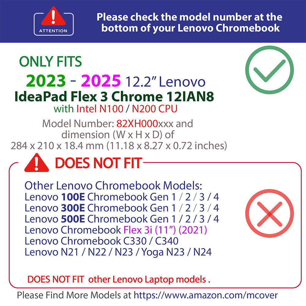 Designed to perfectly fit the 2023-2025 12.2" Lenovo IP Flex 3 Chrome 12IAN8 Convertible Chromebook computers with dimension(WxDxH) of 284 x 210 x 18.4 mm (11.18 x 8.27 x 0.72 inches)