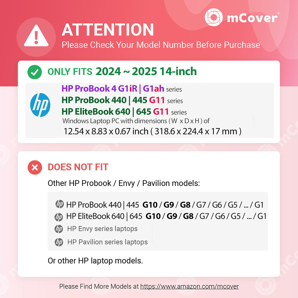 Designed to perfectly fit the 2024 - 2025 14" HP ProBook 440 / 445 G11 and EliteBook 640 | 645 G11 series Windows Notebook PC with dimension of 12.54 x 8.83 x 0.67 inch ( 318.6 x 224.4 x 17 mm )