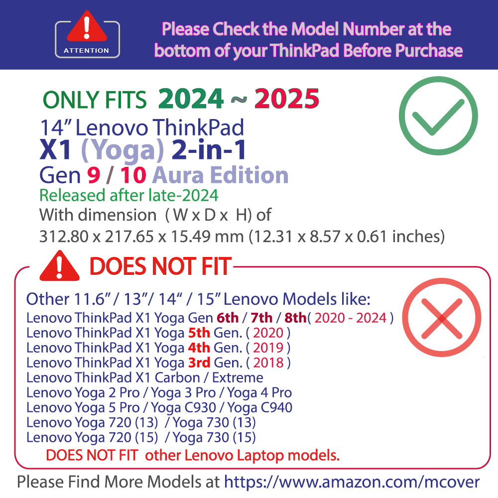 Designed to perfectly fit the 2024 ~ 2025 14-inch Lenovo ThinkPad X1 2-in-1 (Yoga) Gen 9 / 10 series Windows laptop computer with dimension of 12.31 x 8.57 x 0.61 inches( 312.80 x 217.65 x 15.49 mm )