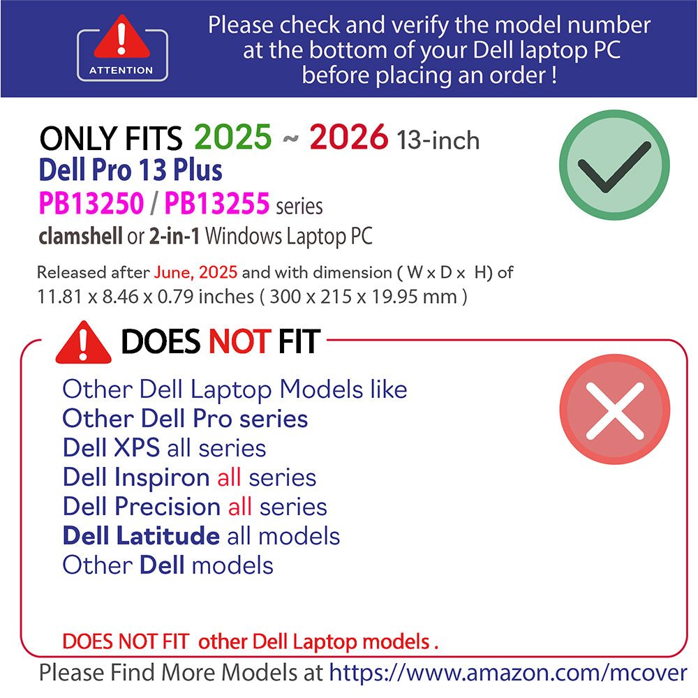 Designed to ONLY fit the 2025 - 2026 13.3" Dell Pro 13 Plus PB13250 / PB13255 clamshell(with 180° Hinge) or 2-in-1(with 360° Hinge) Windows Notebook Computers with dimension of 11.81 x 8.46 x 0.79 inches ( 300 x 215 x 19.95 mm ). Warning: It will NOT fit any other notebook computer models!