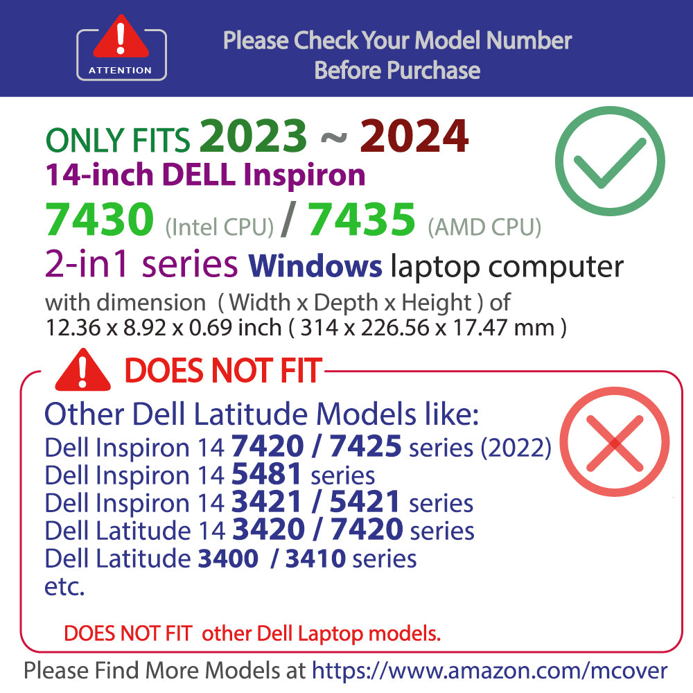 Designed to perfectly fit the 2023~2024 14" Dell Inspiron 14 7430 / 7435 / 7440 / 7445 2-in-1 series Windows Notebook Computers with dimension of 12.36 x 8.92 x 0.69 inch ( 314 x 226.56 x 17.47 mm )