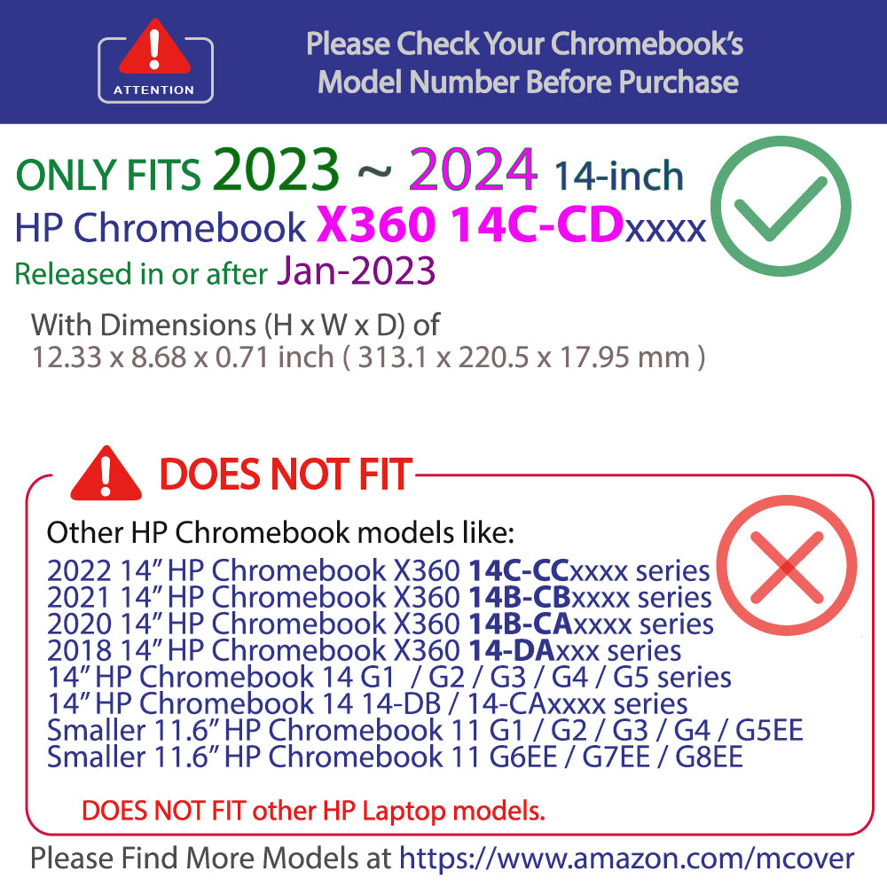 Designed to perfectly fit the 14" HP Chromebook x360 14C-CD0000 series Notebook Computer with dimension of 12.33 x 8.68 x 0.71 inch ( 313.1 x 220.5 x 17.95 mm )