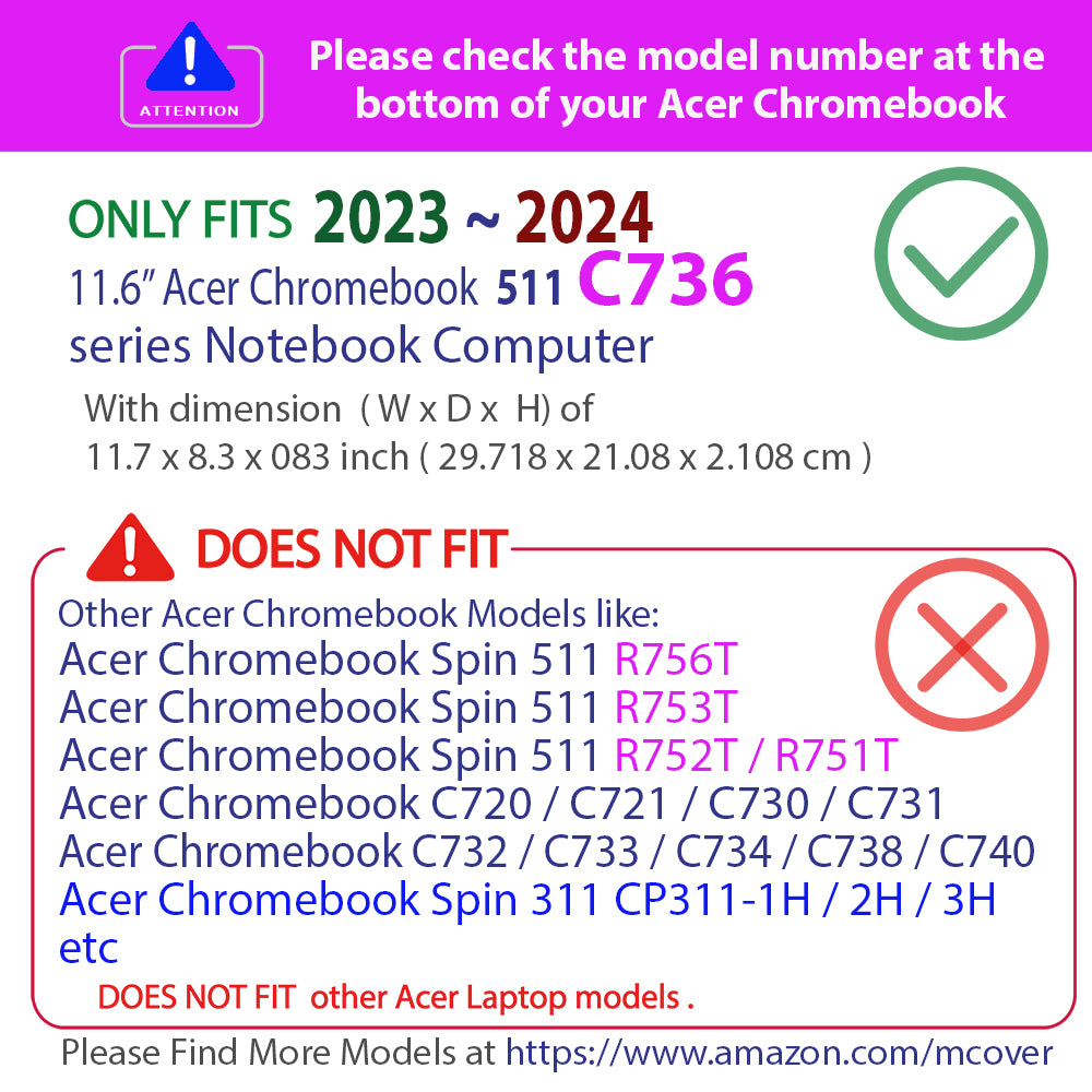 Designed to perfectly fit the 2023~2024 11.6" Acer Chromebook 511 C736 series Notebook Computer with dimension of 11.7 x 8.3 x 0.83 inch ( 29.72 x 21.08 x 2.11 cm )