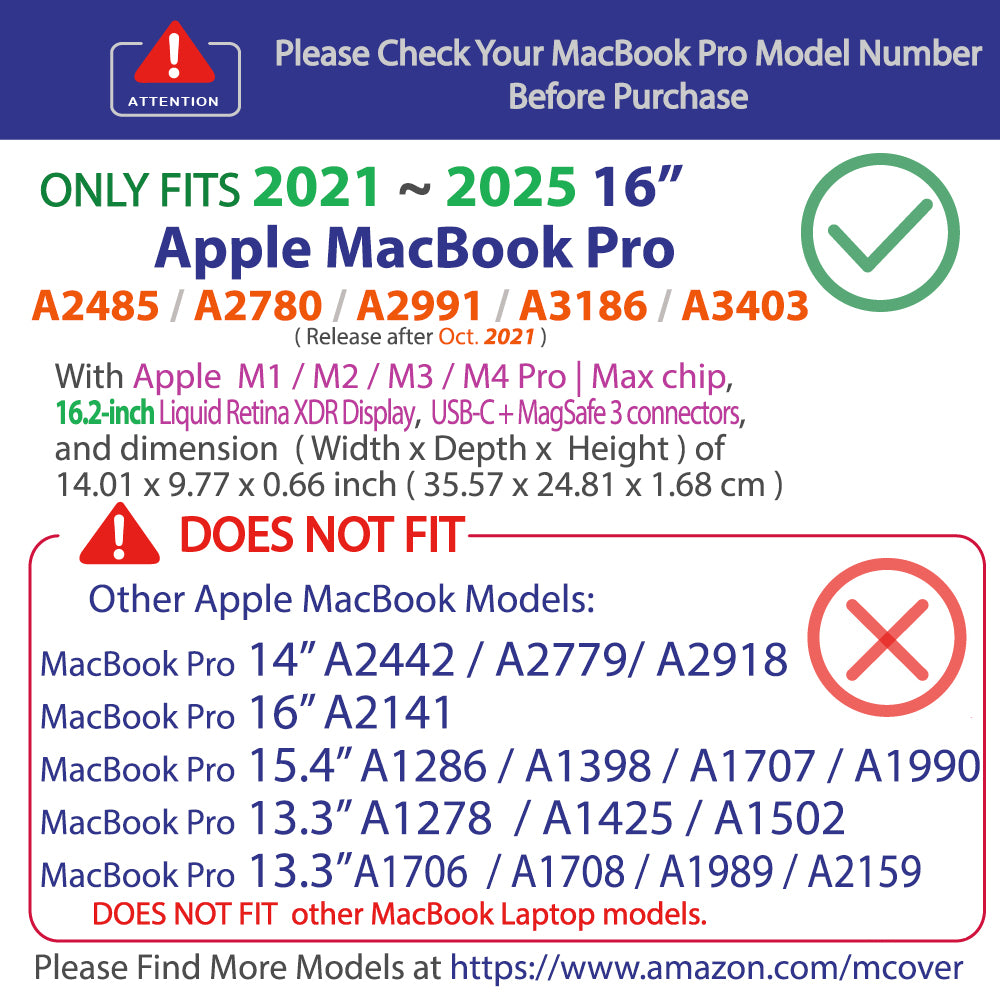 - Designed to perfectly fit the 2021~2025 16” MacBook Pro Laptop Computer (model A2485 / A2770 / A2991 / A3186 / A3403, with M1 | M2 | M3 | M4 Pro / Max Chip, 16.2" Liquid Retina XDR Display, USB-C + MagSafe3 + HDMI connectors )