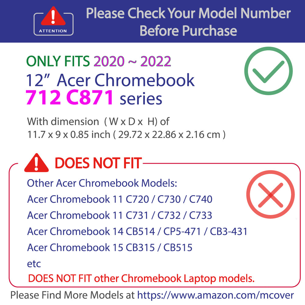 - Designed to perfectly fit the 12" Acer Chromebook 712 C871 Series Laptop Computer with dimension of 11.7 x 9 x 0.85 inch ( 29.72 x 22.86 x 2.16 cm )