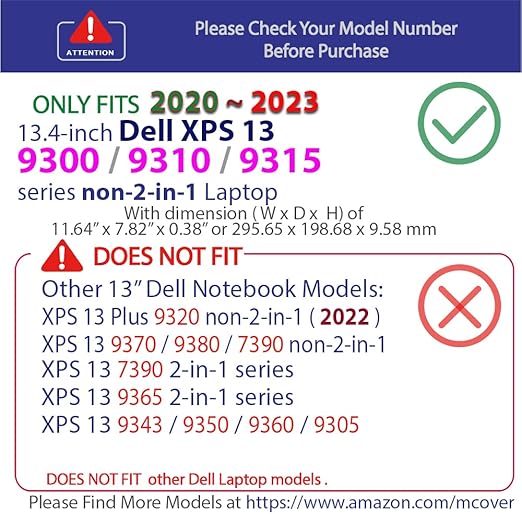 - Designed to perfectly fit the 2020~2023 13.4" Dell XPS 13 9300 / 9310 / 9315 non-2-in-1 Models Notebook Computers with dimension of 11.64 x 7.82 x 0.38 inch ( 295.65 x 198.68 x 9.58 mm )