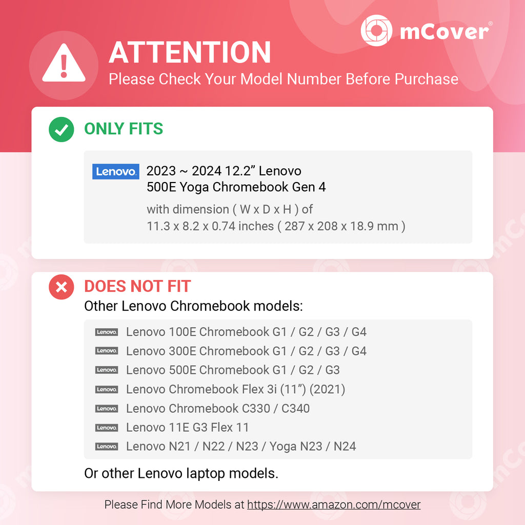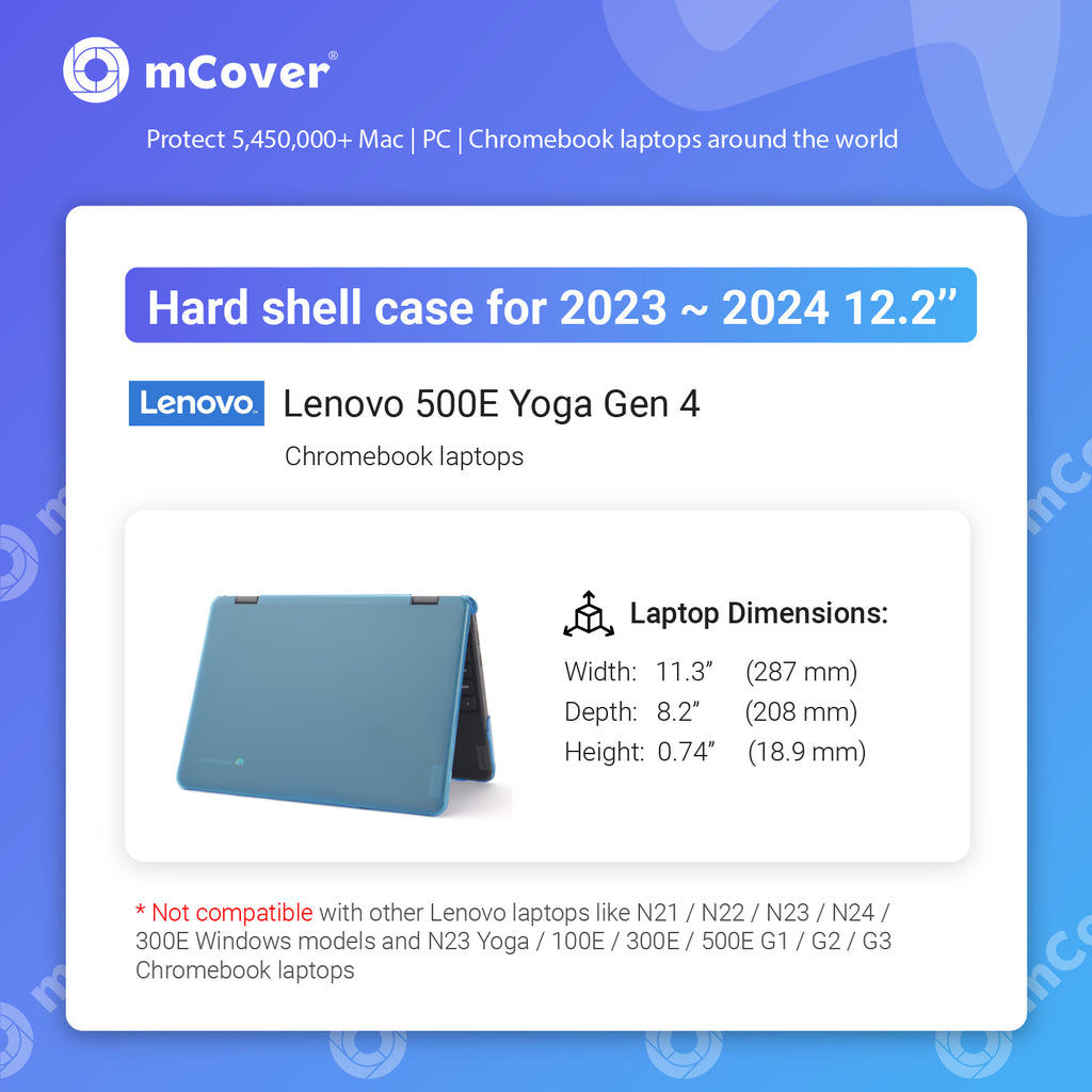 - Designed to perfectly fit the 2023~2024 12.2" Lenovo 500E Yoga ( with 360-degree hinge ) Chromebook Gen 4 Laptop with dimension of 287 x 208 x 18.9 mm (11.3 x 8.2 x 0.74 inches)